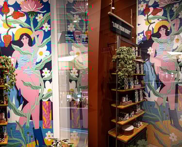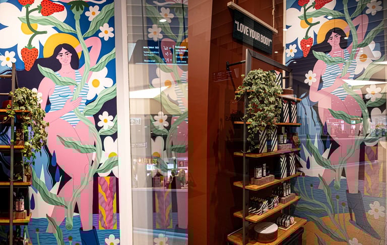 Sukurta autorinė iliustracija fizinei parduotuvei Klaipėdoje, turint pilną kūrybinę laisvę. Iliustracijoje susijungia moteriškumas, gamtos motyvai, pajūrio nuotaika ir pačio produkto ingredientai. Vizualas tapo erdvės dalimi, stiprinančia brando identitetą ir kuriantis emocinį ryšį su lankytojais.