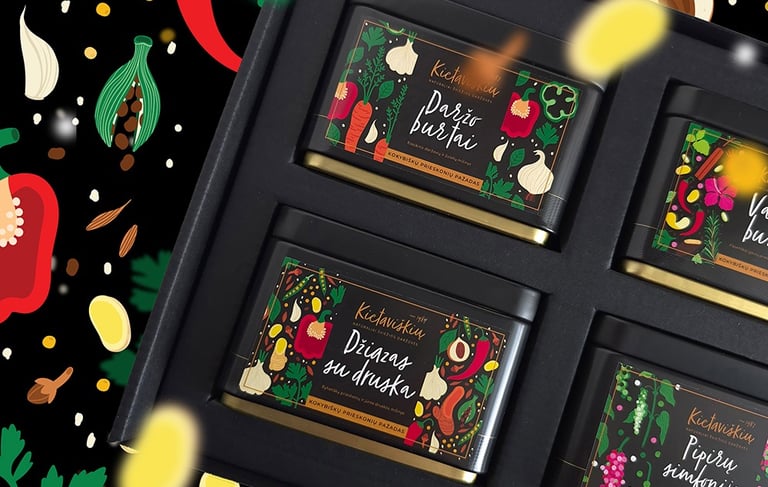 Kietaviškių partneriams skirtų prieskonių dėžučių etiketėms reikėjo aiškaus ir greitai įgyvendinamo dizaino per labai ribotą laiką. Pasirinktas minimalistinis sprendimas su paprastu teksto išdėstymu, leidžiantis lengvai pritaikyti dizainą gamybai. Pagrindiniu vizualiniu akcentu tapo mano kurtos iliustracijos, vaizduojančios kiekvienam prieskoniui būdingus ingredientus. Visas dizainas išlaikytas vieningoje žalioje spalvoje, atliepiančioje Kietaviškių prekės ženklo identitetą.